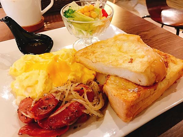 起司炒蛋+德國香腸炒洋蔥+吐司才吃完一片就已經飽飽的了